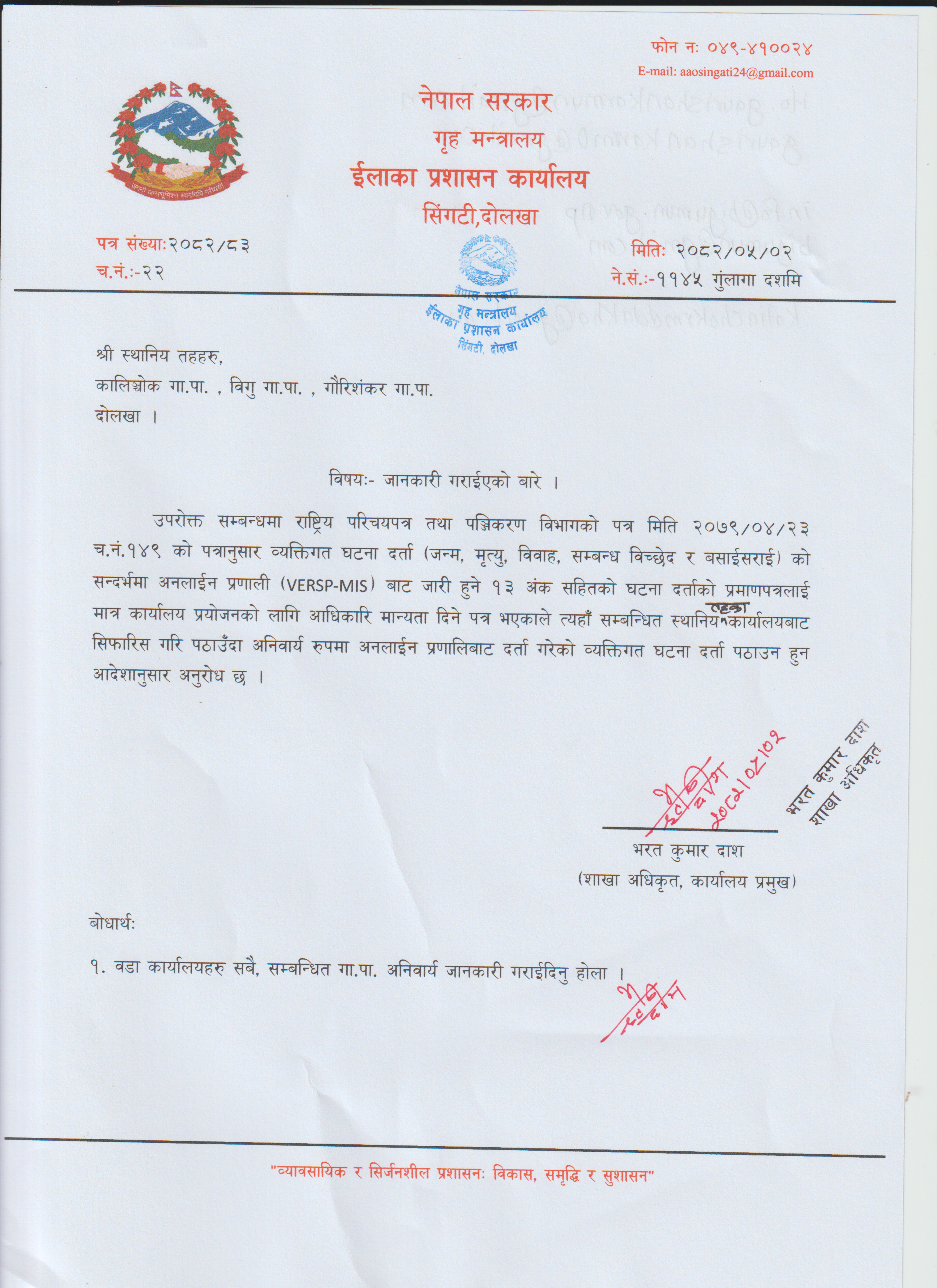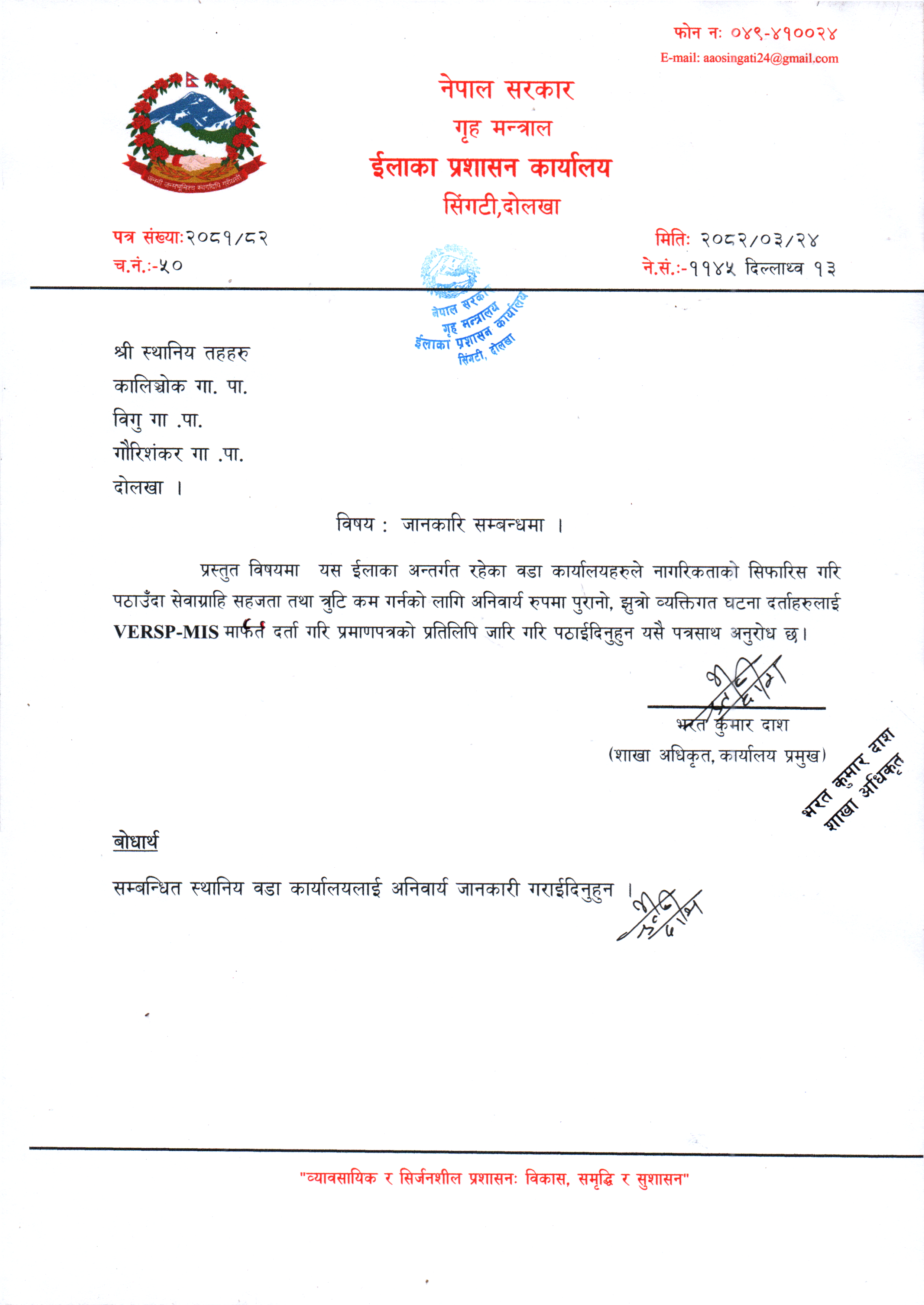 © सर्वाधिकार सुरक्षित इलाका प्रशासन कार्यालय , सिंगटीबजार, दोलखा