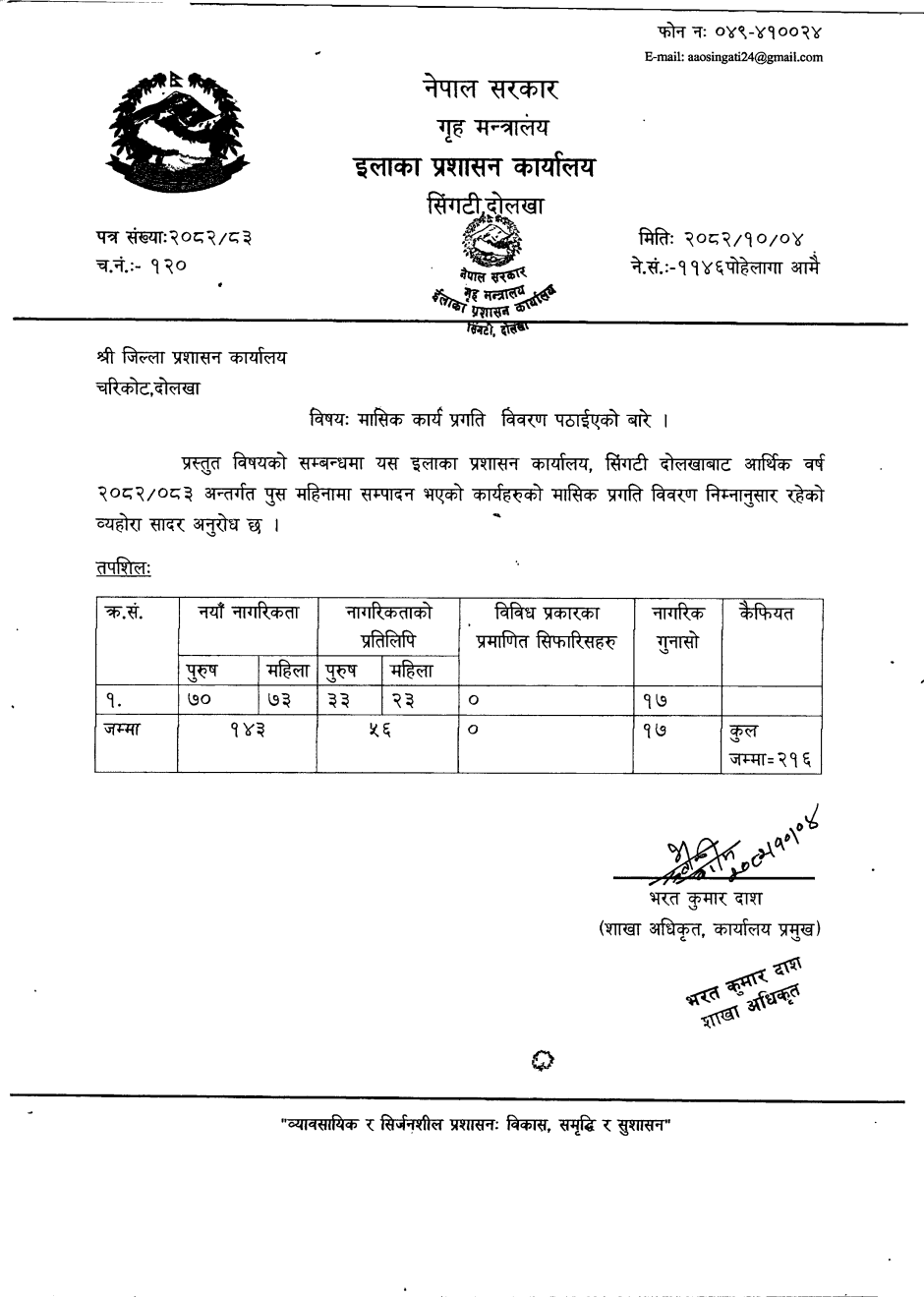 © सर्वाधिकार सुरक्षित इलाका प्रशासन कार्यालय , सिंगटीबजार, दोलखा
