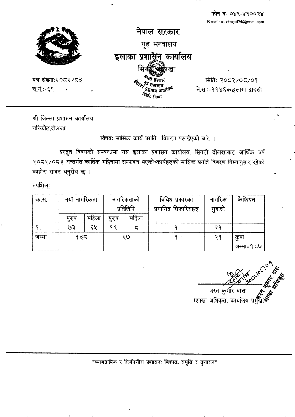 © सर्वाधिकार सुरक्षित इलाका प्रशासन कार्यालय , सिंगटीबजार, दोलखा