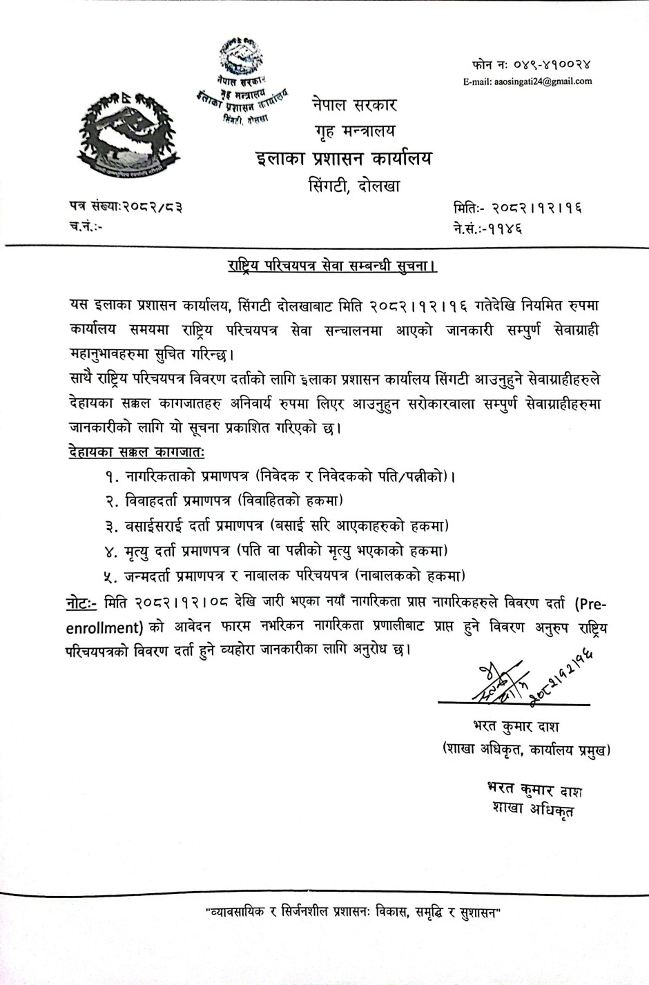 राष्ट्रिय परिचयपत्र सेवा सम्बन्धी सूचना