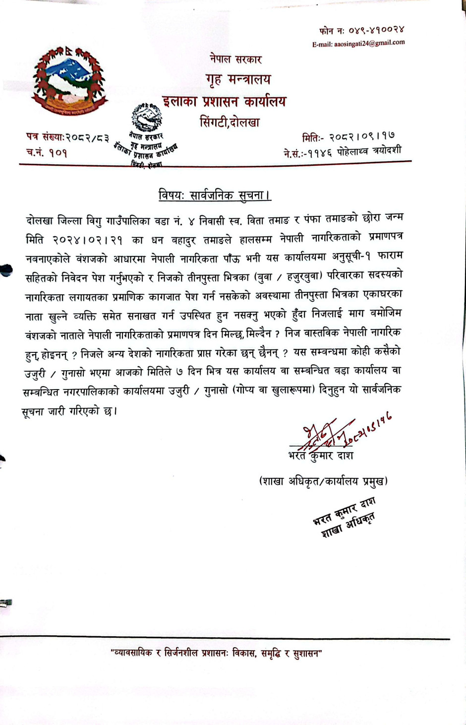 © सर्वाधिकार सुरक्षित इलाका प्रशासन कार्यालय , सिंगटीबजार, दोलखा