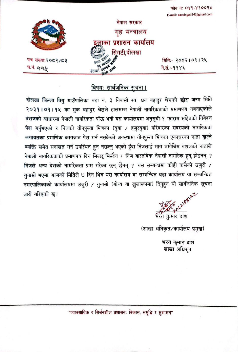 © सर्वाधिकार सुरक्षित इलाका प्रशासन कार्यालय , सिंगटीबजार, दोलखा